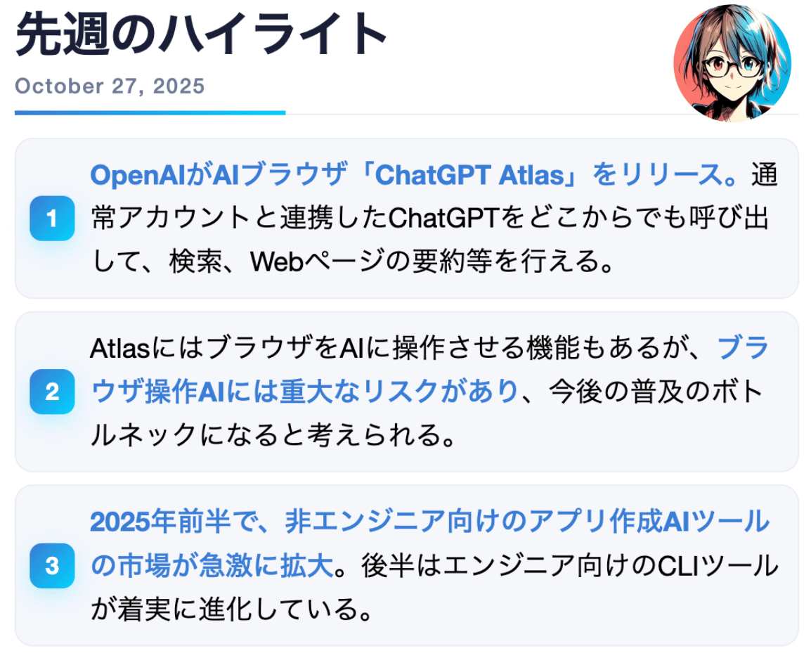 OpenAI社が、AIブラウザ「ChatGPT Atlas」をMacOS向けにリリースしました。ひとことでまとめると「ChatGPTをどこからでも簡単に呼び出せるブラウザ」であり、検索、Webページの要約、メールの文章修正といったタスクを実行させることができます。