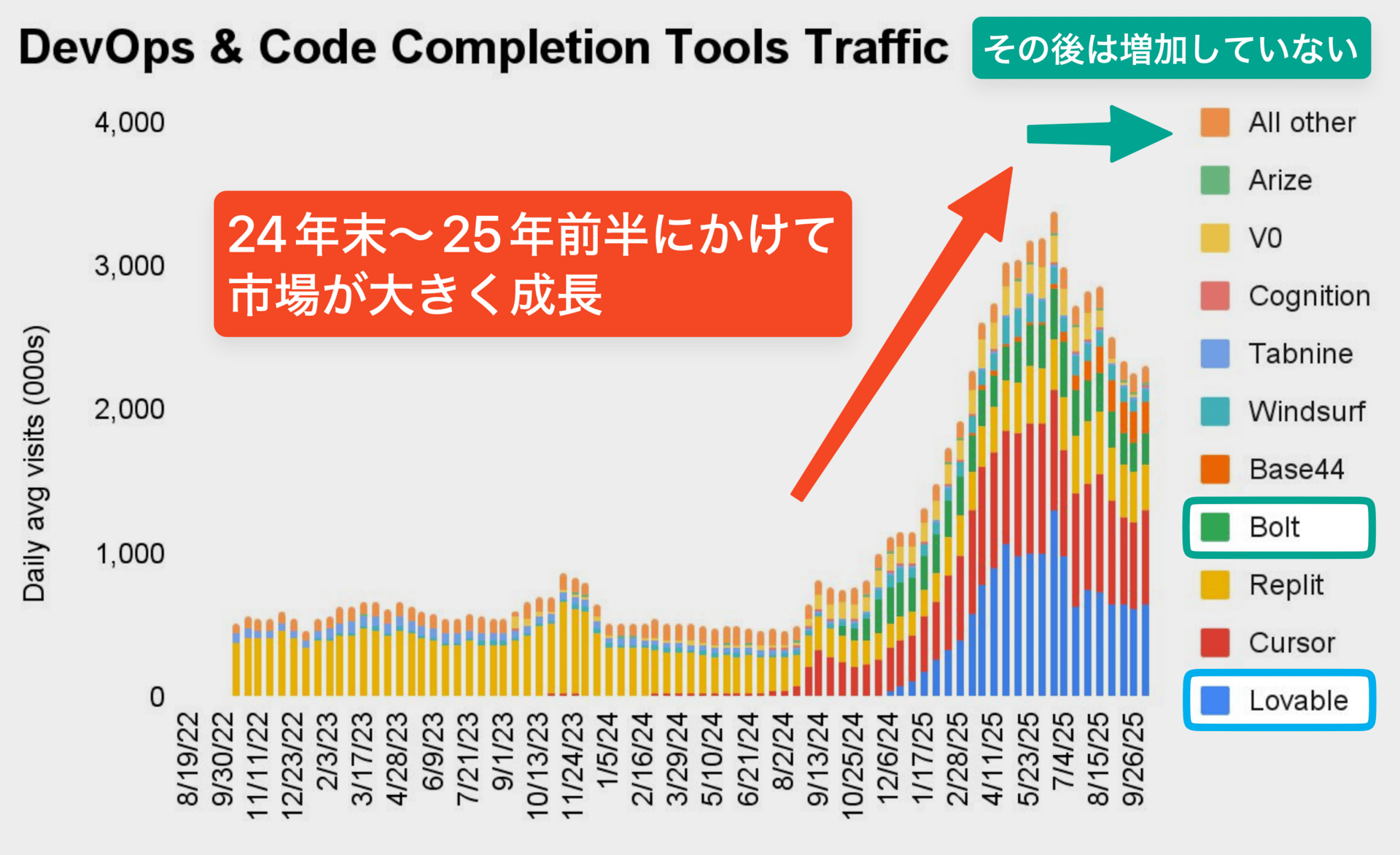 一方で2025年7月以降は全体的にトラフィックが減少しているように見えます。ただしLovableの変動があまりに大きく、その影響を除いて考えれば、そこまで急激な冷え込みではないように思えます。