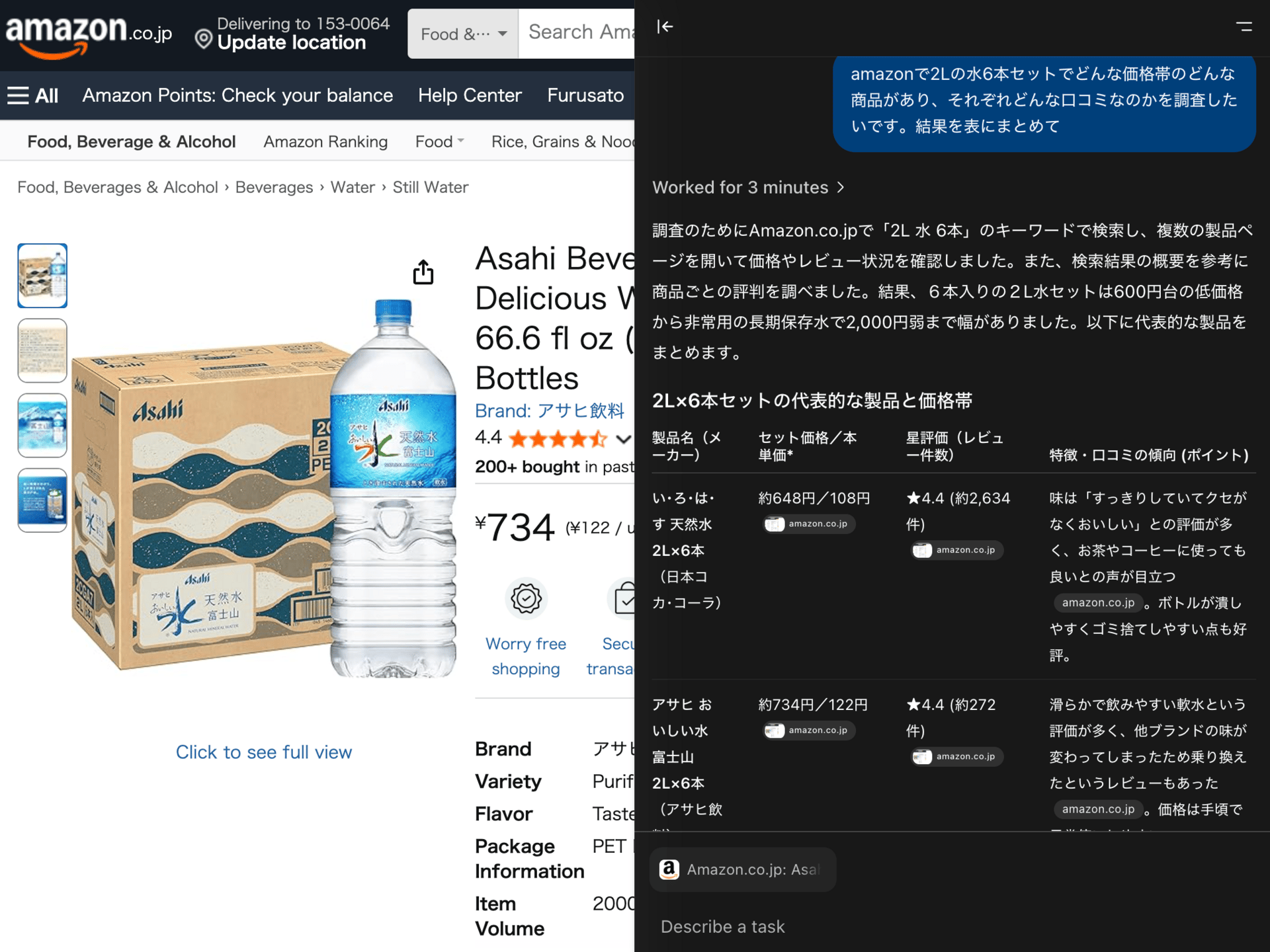 AtlasのAgent modeでamazonで「水」の商品をいくつか検索し、それらの概要を要約するタスクを依頼した結果。3分間待機してようやく回答を得られた。