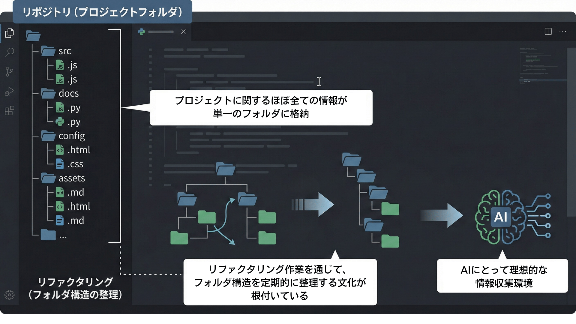 一方、コーディングの世界では、プロジェクトに関連するほぼすべての情報が「リポジトリ」という単一のフォルダにまとめられています。加えて「リファクタリング」という作業を通じて、フォルダ構造を定期的に整理する文化が根付いているため、AIにとって理想的な形で情報が整備されているのです。