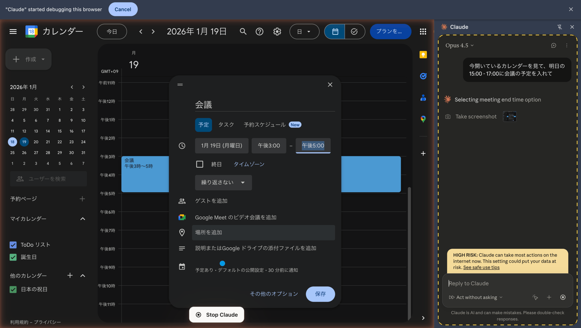 ClaudeのChrome拡張機能を使って、Google Calendarに予定を登録をさせている様子。マウス操作をClaudeが全て自律的に行ってくれる