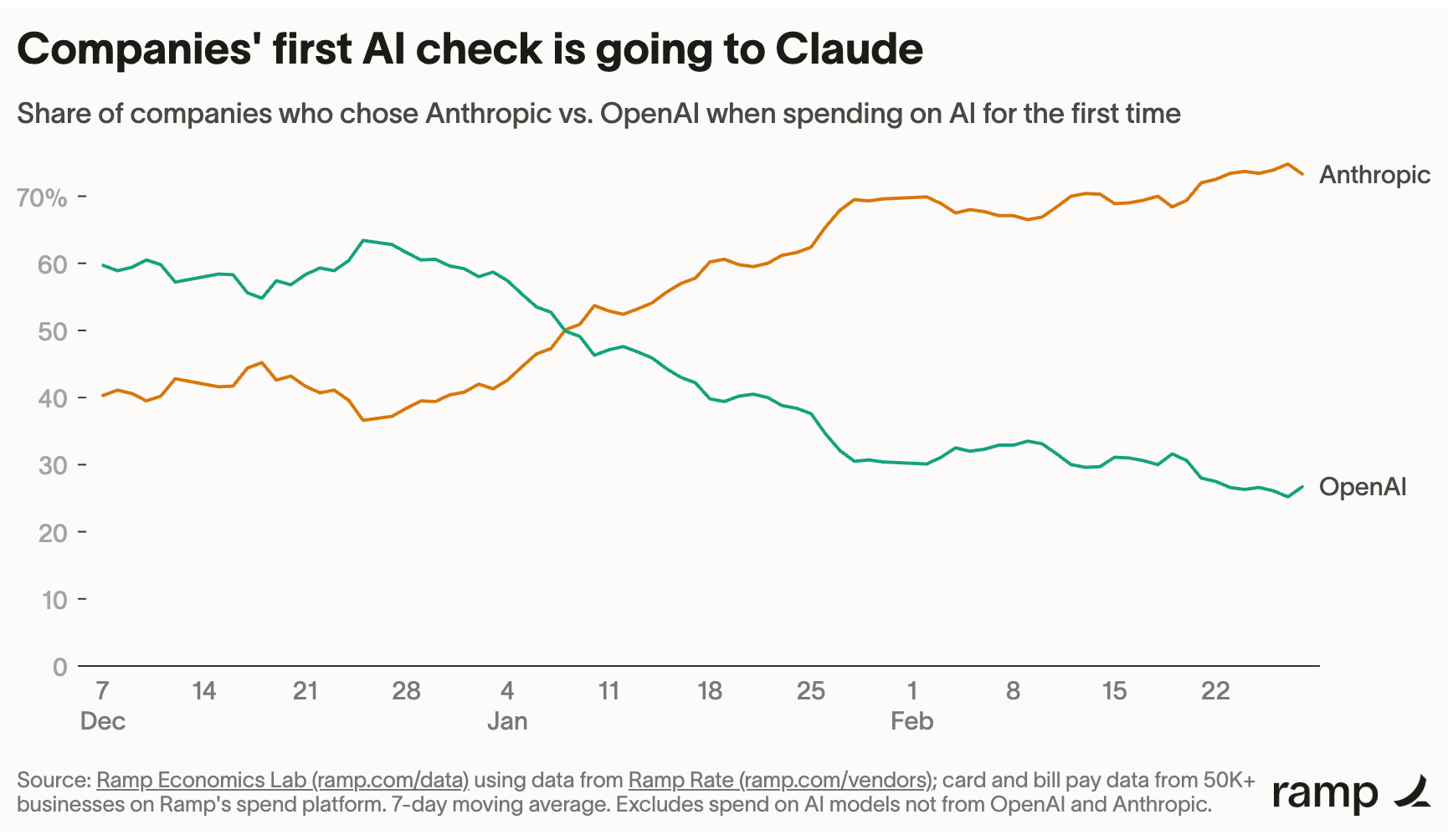 そしてOpenAI社の技術的優位はもうほとんど残っておらず、さらには先行者利益までじわじわと食いつぶされている現状があります。特に直近ではClaude CodeやCoworkを擁するAnthropic社の躍進が目立ち、Ramp社の調査によれば、AIを新規導入する企業の約70%がOpenAIではなくAnthropicを選択しているといいます。