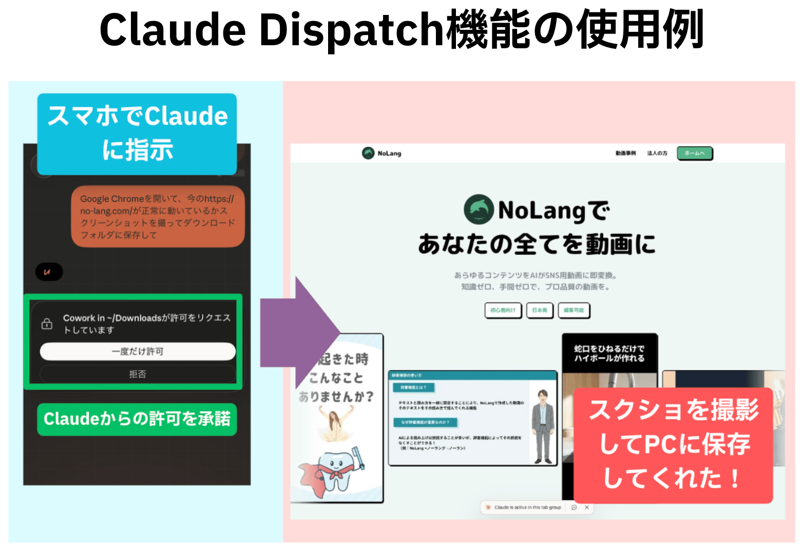 Claude Dispatch機能を使って、NoLangのLPのスクリーンショットを撮影し、PCフォルダに保存させた例。利用するPCは起動している必要がある点に注意。