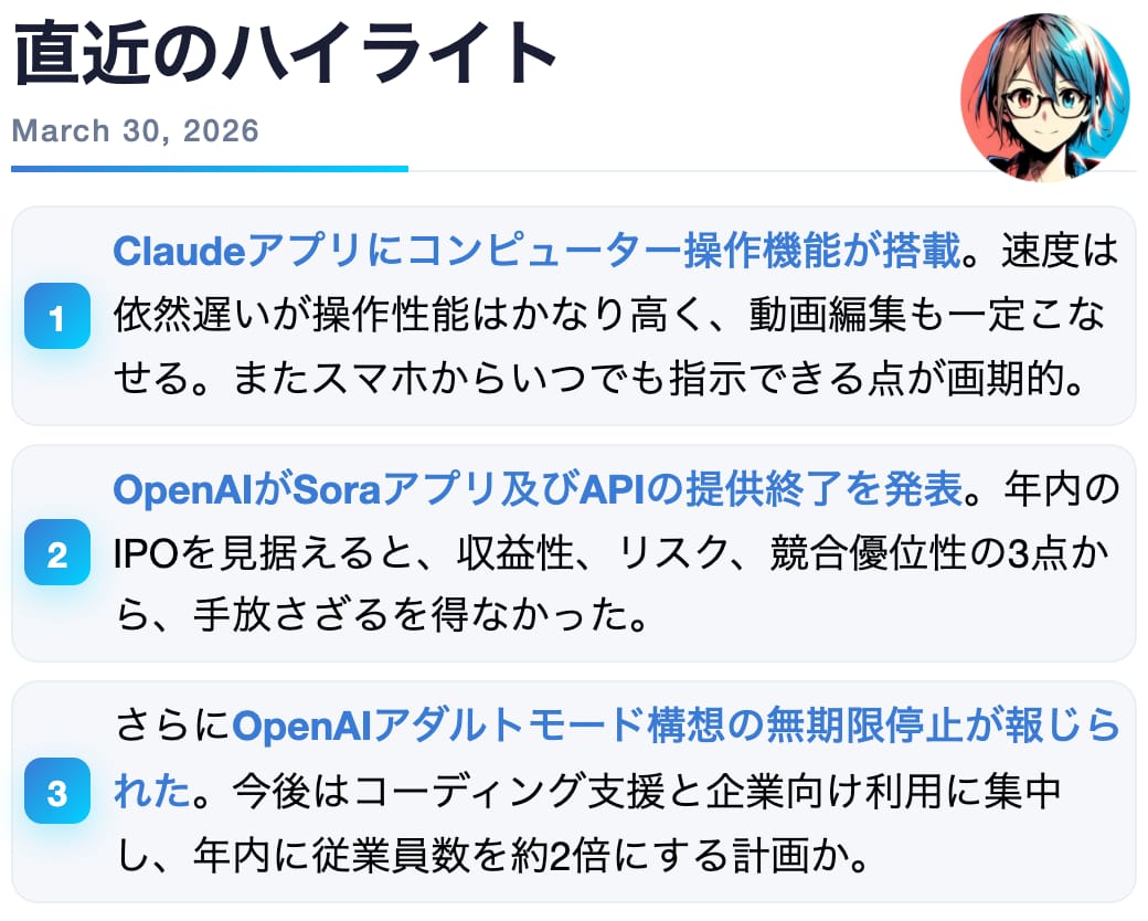 いずれにせよ、先週の一連の発表は、OpenAI社が現実路線への方針転換を迫られていることを決定づけたのではないでしょうか。IPOを控えた同社にとって、夢を追うフェーズから収益の柱を固めるフェーズへの移行は避けられなかったようです。